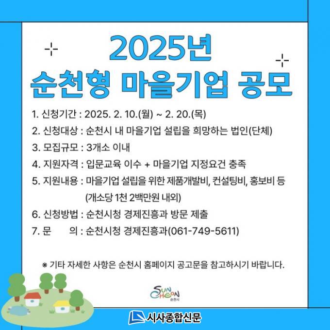 À̹ø ¼øÃµÇü ¸¶À»±â¾÷ÀÇ Áö¿ø±Ô¸ð´Â 3°³¼Ò ³»¿Ü·Î, ±â¾÷´ç 1õ 2¹é¸¸ ¿ø ³»¿ÜÀÇ »ç¾÷ºñ¸¦ Áö¿ø¹Þ´Â´Ù. ½Åû ÀÚ°ÝÀº ¸¶À»±â¾÷ ÁöÁ¤¿ä°Ç(°øµ¿Ã¼¼º, °ø°ø¼º, ±â¾÷¼º, Áö¿ª¼º)À» ¸ðµÎ ÃæÁ·Çϰí, ´ëÇ¥ÀÚ Æ÷ÇÔ È¸¿ø 5ÀÎ ÀÌ»óÀÌ ¡®¼øÃµÇü ¸¶À»±â¾÷ ÀÔ¹®±³À°¡¯¶Ç´Â Àü³²¿¡¼ ÁÖ°üÇÏ´Â ¸¶À»±â¾÷ ±³À°À» À̼öÇÑ ´Üü ¶Ç´Â ¹ýÀÎÀÌ´Ù.