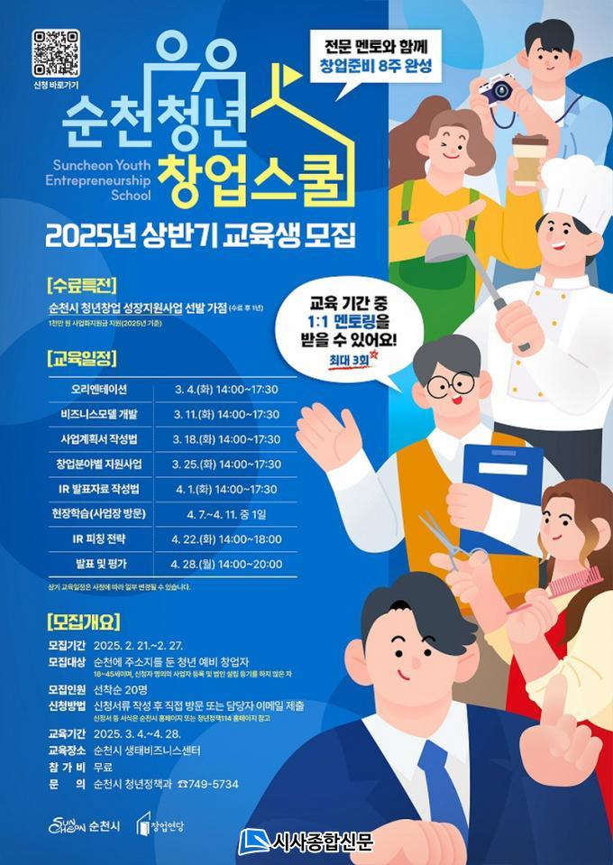 ¸ðÁý´ë»óÀº »ç¾÷ÀÚµî·ÏÀ» ÇÏÁö ¾ÊÀº ¼øÃµ½Ã °ÅÁÖ Ã»³âÀ¸·Î, ¼±Âø¼ø 20¸íÀÌ´Ù. ±³À°ºñ´Â ¹«·áÀ̸ç, ±³À° ¼ö·á ÈÄ 1³â°£ ¼øÃµ½Ã û³ââ¾÷ ¼ºÀåÁö¿ø»ç¾÷ ´ë»óÀÚ ¼±¹ß ½Ã °¡Á¡ ÇýÅõµ ÁÖ¾îÁø´Ù.