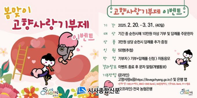 | ¼øÃµ½Ã, °íÇâ»ç¶û±âºÎÁ¦ º½¸ÂÀÌ Æ¯º° À̺¥Æ® ÁøÇà ¿À´Â 3¿ù 31ÀϱîÁö ±âºÎÀÚ ´ë»ó Ãß°¡ ´ä·Êǰ Á¦°ø |