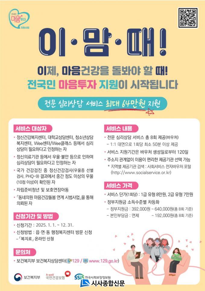 Áö¿ø ´ë»óÀº ¡ãÁ¤½Å°Ç°º¹Áö¼¾ÅÍ¡¤Á¤½ÅÀÇ·á±â°ü¡¤Çб³»ó´ã¼¾ÅÍ µî¿¡¼ ½É¸®»ó´ãÀÌ ÇÊ¿äÇÏ´Ù°í ÀÎÁ¤ÇÏ´Â ÀÇ·Ú¼ ¶Ç´Â Áø´Ü¼¸¦ ¹ß±Þ¹ÞÀº ±¸¹Î ¡ã±¹°¡ °Ç°°ËÁø¿¡¼ Áߵ ÀÌ»ó(10Á¡ ÀÌ»ó) ¿ì¿ï Áõ»óÀÌ È®ÀÎµÈ ±¸¹Î ¡ãÀÚ¸³Áغñ û³â°ú º¸È£¿¬À徯µ¿ µîÀÌ´Ù.