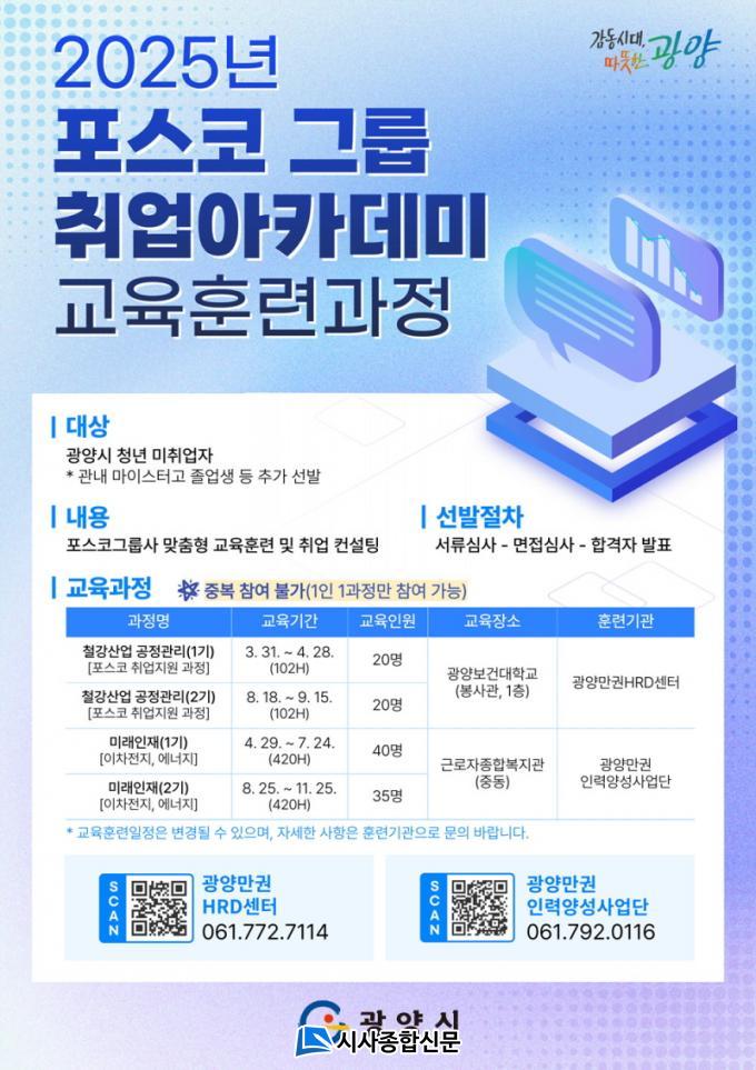 ÈÆ·Ã°úÁ¤¿¡ °üÇÑ ³»¿ëÀº ¡°±ÂÀⱤ¾ç¡± ´©¸®Áý(https://job.gwangyang.go.kr)¿¡¼ È®ÀÎÇÒ ¼ö ÀÖÀ¸¸ç, ±³À°»ý ¸ðÁý ¹× Áö¿ø °ü·ÃÇØ ±Ã±ÝÇÑ Á¡Àº °úÁ¤º° ÈÆ·Ã±â°üÀÎ ±¤¾ç¸¸±ÇHRD¼¾ÅÍ(¢Ï061-772-7114)¿Í ±¤¾ç¸¸±ÇÀη¾缺»ç¾÷´Ü(¢Ï061-792-0116)À¸·Î ¹®ÀÇÇÏ¸é µÈ´Ù.