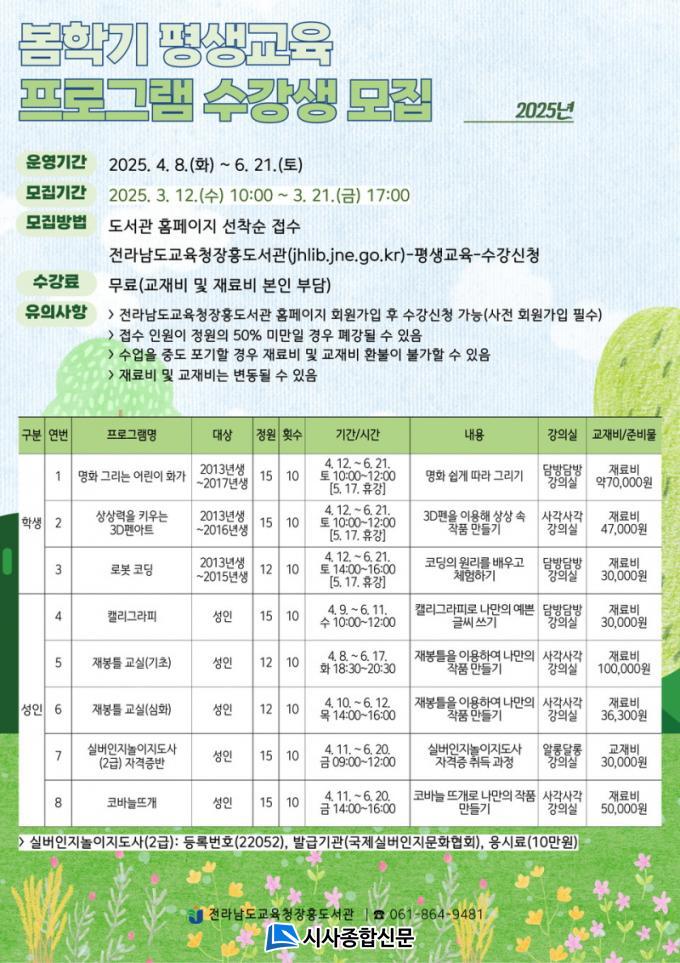 Âü°¡ÀÚ ¸ðÁýÀº 3¿ù 12ÀÏ(¼ö) ¿ÀÀü 10½ÃºÎÅÍ 3¿ù 21ÀÏ(±Ý) ¿ÀÈÄ 5½Ã±îÁö µµ¼°ü ȨÆäÀÌÁö(https://jhlib.jne.go.kr)¸¦ ÅëÇØ ¼±Âø¼øÀ¸·Î ¸ðÁýÇÑ´Ù.