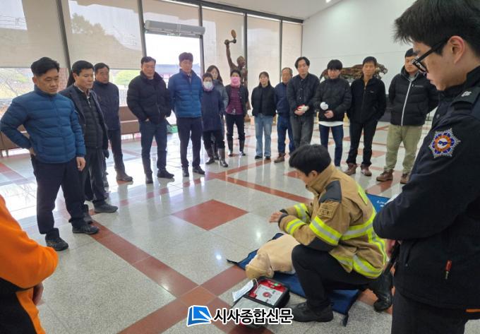 ÇÕµ¿ÈÆ·Ã ÈÄ »ïÈ£119¾ÈÀü¼¾ÅÍ ÁÖ°üÀ¸·Î Àü½Ã°ü ÀÌ¿ë µµÁß ½ÉÁ¤Áö ȯÀÚ ¹ß»ý ´ëºñ¸¦ À§ÇÑ ½ÉÆó¼Ò»ý¼ú ¹× ÀÚµ¿½ÉÀåÃæ°Ý±â(AED) »ç¿ë¹ý ±³À°µµ À̾îÁ³´Ù.
