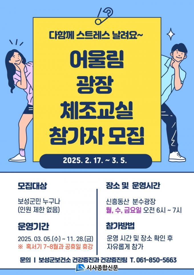 ƯÈ÷, ´ëÇ¥ ÇÁ·Î±×·¥ÀÎ ¡®¾î¿ï¸² ±¤ÀåüÁ¶±³½Ç¡¯Àº ÁֹεéÀÇ ¾ÆÄ§ ½ÅüȰµ¿À» Àå·ÁÇϱâ À§ÇØ ¸ÅÁÖ ¿ù¡¤¼ö¡¤±Ý¿äÀÏ ¿ÀÀü 6½ÃºÎÅÍ 7½Ã±îÁö ½ÅÈﵿ»ê ºÐ¼ö ±¤Àå¿¡¼ ÁøÇàµÈ´Ù. ÀÌ¿Í ÇÔ²² ¡®½ÅüȰµ¿ ±³½Ç¡¯Àº ÁÖ 1~2ȸ ¿î¿µµÇ¸ç, ÁÖ°£ 6°³¼Ò¿Í ¾ß°£ 4°³¼Ò¿¡¼ ÁøÇàµÅ ÁֹεéÀÇ »ýȰ ÆÐÅÏ¿¡ ¸ÂÃá ź·ÂÀûÀÎ ¿î¿µÀÌ ÀÌ·ïÁö°í ÀÖ´Ù.