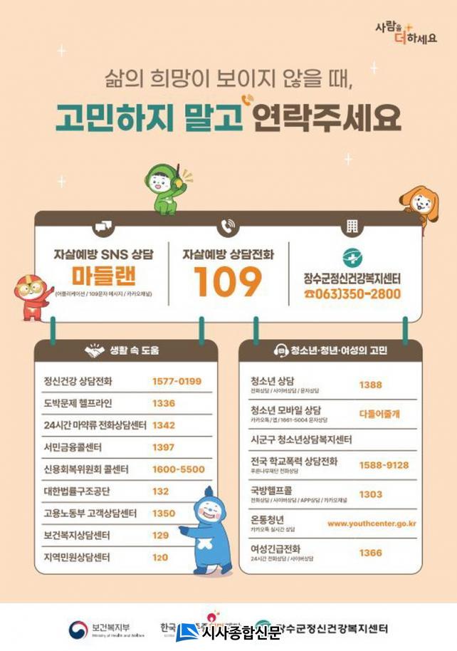 Àڻ쿹¹æ ¹× Á¤½Å°Ç°»ó´ã ¹®ÀÇ´Â Àڻ쿹¹æ »ó´ãÀüÈ(¢Ï109) ¶Ç´Â Àå¼ö±º Á¤½Å°Ç°º¹Áö¼¾ÅÍ(¢Ï063-350-2800)·Î ¹®ÀÇÇÏ¸é µµ¿ò¹ÞÀ» ¼ö ÀÖ´Ù.
