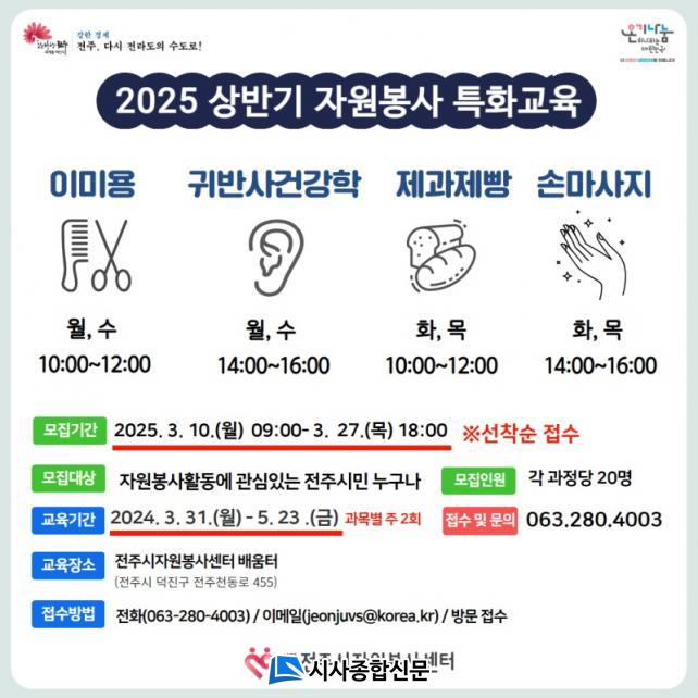 ÇÑÆí, ÀüÁÖ½ÃÀÚ¿øºÀ»ç¼¾ÅÍ´Â Áö³ 2003³âºÎÅÍ ¸Å³â »ó¡¤ÇϹݱâ 2Â÷·Ê¿¡ °ÉÃÄ ÀÚ¿øºÀ»ç Ȱµ¿¿¡ ÇÊ¿äÇÑ Àü¹® ºÐ¾ß¸¦ ¹«·á·Î ±³À°À» ÁøÇàÇϰí ÀÖÀ¸¸ç, À̸¦ ÅëÇØ ¸Å³â 200¿© ¸íÀÇ Àç´É³ª´® ºÀ»çÀÚ¸¦ ¾ç¼ºÇϰí ÀÖ´Ù.