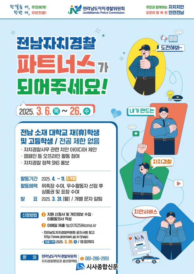 ÀÚÄ¡°æÂû¿¡ °ü½ÉÀÌ ¸¹°í ¿Á¤ ÀÖ´Â Àü³²Áö¿ª ´ëÇлýÀ̳ª °íµîÇлýÀÌ¸é °³ÀÎ ¶Ç´Â ÆÀÀ» ±¸¼ºÇØ ´©±¸³ª Áö¿øÇÒ ¼ö ÀÖ´Ù. Âü¿© ½ÅûÀº Àü³²ÀÚÄ¡°æÂûÀ§¿øÈ¸ ´©¸®Áý(www.jeonnam.go.kr/jnapc)¿¡¼ ¿Â¶óÀÎ ½Åû¼¸¦ ³»·Á¹Þ¾Æ À̸ÞÀÏ·Î Á¦ÃâÇÏ¸é µÈ´Ù.