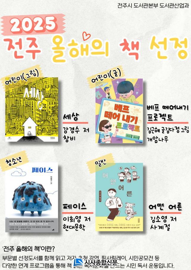 ÀüÁֽô ¡®2025 ÀüÁÖ ¿ÃÇØÀÇ Ã¥¡¯À¸·Î ¡â¼¼»ó(°°æ¼ö Àú, âºñ) ¡âº£ÇÁ ¶¼¾î³»±â ÇÁ·ÎÁ§Æ®(±è±ÙÇý ±Û¡¤±è´ÙÁ¤ ±×¸², °³¾Ï³ª¹«) ¡âÆäÀ̽º(ÀÌÈñ¿µ Àú, Çö´ë¹®ÇÐ) ¡â¾î¶² ¾î¸¥(±è¼Ò¿µ Àú, »ç°èÀý) µî ÃÑ 4±ÇÀÇ µµ¼¸¦ ¼±Á¤Çß´Ù°í 11ÀÏ ¹àÇû´Ù.