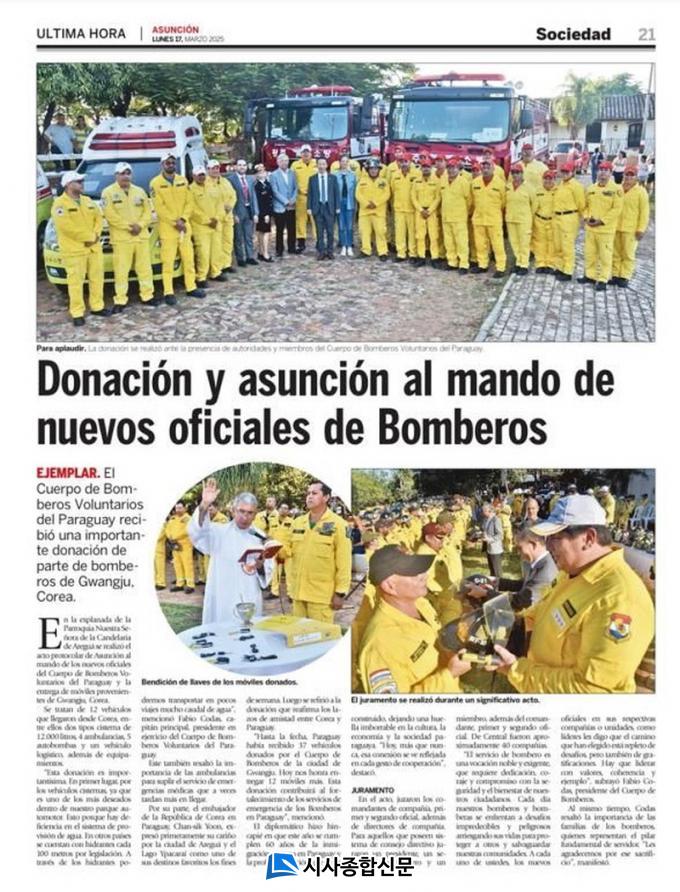 ¶Ç Áö³ 2018³âºÎÅÍ 2024³â±îÁö ³»¿ë¿¬¼ö°¡ °æ°úÇÑ ¼Ò¹æÂ÷·® 49´ë¸¦ ¹«»ó Áö¿øÇß´Ù. ¿ÃÇØ´Â ¼Ò¹æÂ÷·® 6´ë(ÆßÇÁÂ÷ 3´ë, ±¸±ÞÂ÷ 3´ë)¿Í ÇÔ²² ±¤ÁÖ¼Ò¹æ¾ÈÀüº»ºÎ ±³À°ÈƷôÜÀ» ÆÄ¶ó°úÀÌ ÇöÁö¿¡ ÆÄ°ß, ±¤ÁÖ¼Ò¹æÀÇ ¼±Áø ¼Ò¹æ±â¼úÀ» Àü¼öÇÏ´Â µî Æø³ÐÀº Áö¿øÀ» ÇÒ °èȹÀÌ´Ù.