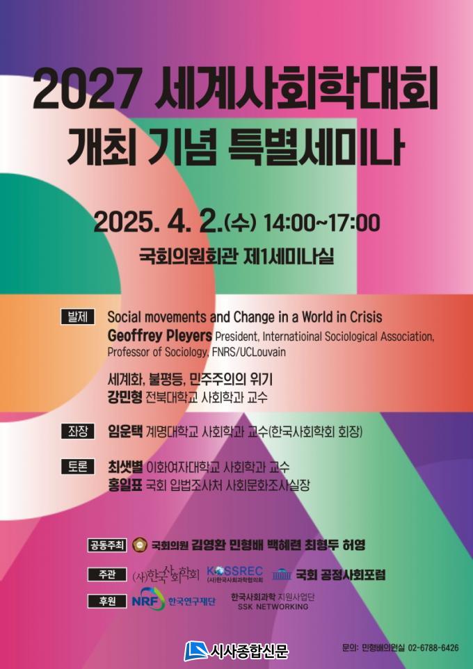À̹ø ¼¼¹Ì³ª´Â 2027³â ´ëÇѹα¹ ±¤ÁÖ¿¡¼ °³ÃÖ ¿¹Á¤ÀÎ ¼¼°è»çȸÇдëȸ(ISA World Congress of Sociology)¸¦ ¾ÕµÎ°í, ¡¸±Û·Î¹ú À§±â ¼Ó »çȸº¯µ¿°ú ¹ÎÁÖÁÖÀÇ¡¹¶ó´Â ÁÖÁ¦·Î ¿¸°´Ù.