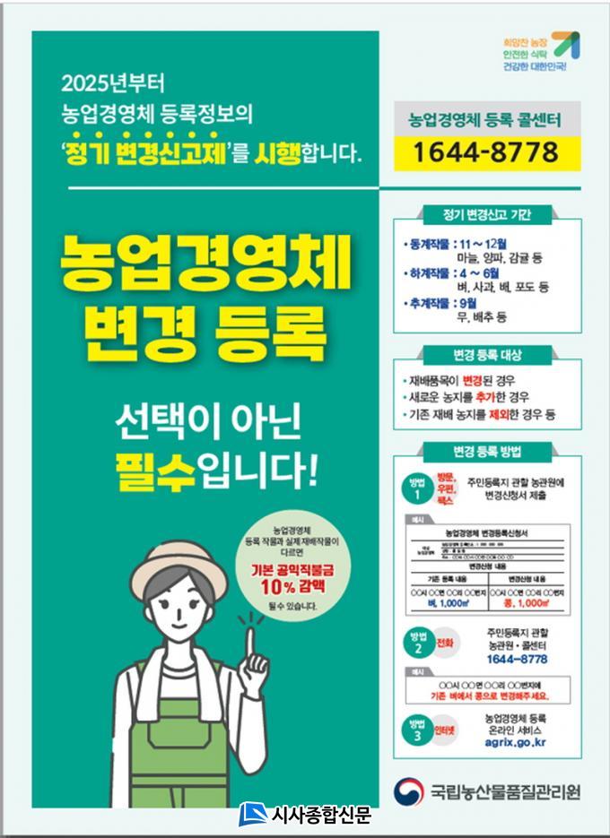 ³ó°ü¿ø °î¼º․±¸·Ê»ç¹«¼ÒÀåÀº ¡°°æ¿µÃ¼ µî·ÏÁ¤º¸ÀÇ Á¤È®µµ¸¦ ³ôÀÌ·Á¸é ³ó¾÷ÀÎÀÇ Àû±ØÀûÀÎ Âü¿©°¡ ÇʼöÀû¡±À̶ó°í Çϸé¼, ¡°Àç¹èǰ¸ñÀ̳ª ³óÁö°¡ º¯°æµÈ ³ó°¡´Â À̹ø Á¤±â º¯°æ ½Å°í±â°£¿¡ ²À ½Å°íÇØ ´Þ¶ó¡±°í ´çºÎÇÏ¿´´Ù.