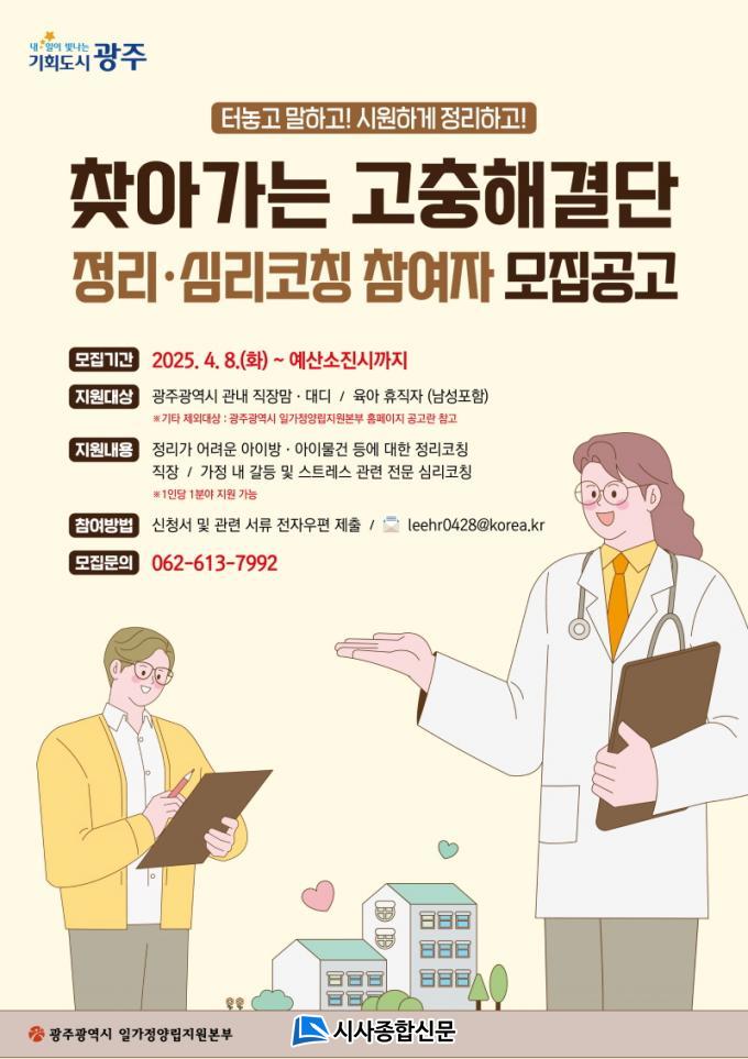 [½Ã»çÁ¾ÇսŹ® = ¿À½ÂÅà ±âÀÚ] ±¤ÁÖ±¤¿ª½Ã Àϰ¡Á¤¾ç¸³Áö¿øº»ºÎ´Â Áö¿ª Áß¼Ò»ç¾÷Àå¿¡¼­ ±Ù¹«ÇÏ´Â Á÷À帾‧´ëµð(À°¾ÆÈÞÁ÷ÀÚ Æ÷ÇÔ)ÀÇ Àϰ¡Á¤ ¾ç¸³À» À§ÇØ ¡®Ã£¾Æ°¡´Â °íÃæÇØ°á´Ü¡¯À» ¿î¿µ, ºÐ¾ßº° ¸ÂÃã Àü¹®ÄÚĪÀ» Áö¿øÇÑ´Ù.