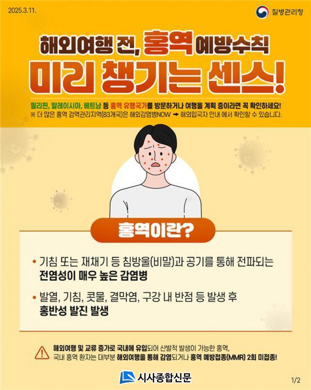 ÀüºÏÀÚÄ¡µµ´Â ÇØ¿Ü¿©ÇàÀ» °èȹ ÁßÀÎ µµ¹Î¿¡°Ô È«¿ª ¿¹¹æÁ¢Á¾(MMR) 2ȸ ¸ðµÎ Á¢Á¾ÇÏ¿´´ÂÁö È®ÀÎ*Çϰí, ¹ÌÁ¢Á¾ ¶Ç´Â Á¢Á¾¿©ºÎ°¡ ºÒÈ®½ÇÇÑ °æ¿ì Ãâ±¹ 6ÁÖ Àü ÀÇ·á±â°üÀ» ¹æ¹®ÇÏ¿© 2ȸ Á¢Á¾(ÃÖ¼Ò 4ÁÖ °£°Ý)À» ¿Ï·áÇÒ °ÍÀ» ±Ç°íÇß´Ù. ƯÈ÷, »ýÈÄ 1¼¼ ¹Ì¸¸ ¿µÀ¯¾Æ´Â ¸é¿ª·ÂÀÌ ³·¾Æ È«¿ª À¯Çà±¹ ¹æ¹®À» ÀÚÁ¦Çϰí, ºÎµæÀÌÇÑ °æ¿ì¿¡´Â Ãâ±¹ 2ÁÖ Àü(»ýÈÄ 6~11°³¿ù) Á¶±â ¿¹¹æÁ¢Á¾À» °í·ÁÇØ¾ß ÇÑ´Ù.