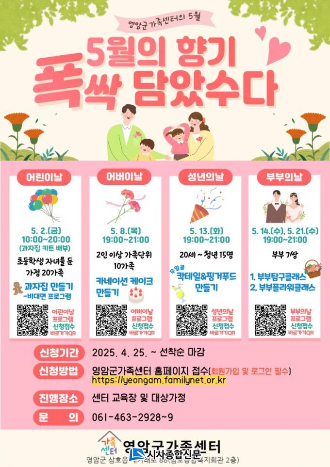 8ÀÏ ¾î¹öÀ̳¯¿¡´Â °¡Á·¼¾ÅÍ ±³À°Àå¿¡¼ ºÎ¸ð¿Í ÇÔ²²ÇÏ´Â ¡®Ä«³×ÀÌ¼Ç ÄÉÀÌÅ© ¸¸µé±â¡¯°¡ ÁøÇàµÈ´Ù. 13ÀÏ ¼º³âÀÇ ³¯¿¡´Â û³âÀÌ Âü¿©ÇÏ´Â ¡®¹«¾ËÄÝ Ä¬Å×ÀÏ & ÇΰÅǪµå ¸¸µé±â¡¯ üÇèÀÌ, 21ÀÏ ºÎºÎÀÇ ³¯¿¡´Â ¡®ºÎºÎ ²É¹Ù±¸´Ï ¸¸µé±â¡¯°¡ ¿¸°´Ù.