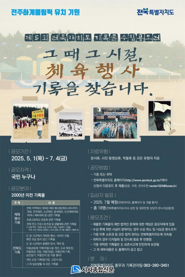 À̹ø °ø¸ðÀüÀº ¡®±×¶§ ±× ½ÃÀý, üÀ°Çà»ç ±â·ÏÀ» ã½À´Ï´Ù¡¯¸¦ ÁÖÁ¦·Î ÁøÇàµÇ¸ç, ÀüºÏ Áö¿ª¿¡¼ °³ÃÖµÈ ´ë±Ô¸ð üÀ°´ëȸ, üÀ°Çà»ç, ÇÐâ½ÃÀý ¿îµ¿È¸ µîÀÇ ±â·Ï¹°À» ¼öÁýÇÒ °èȹÀÌ´Ù.