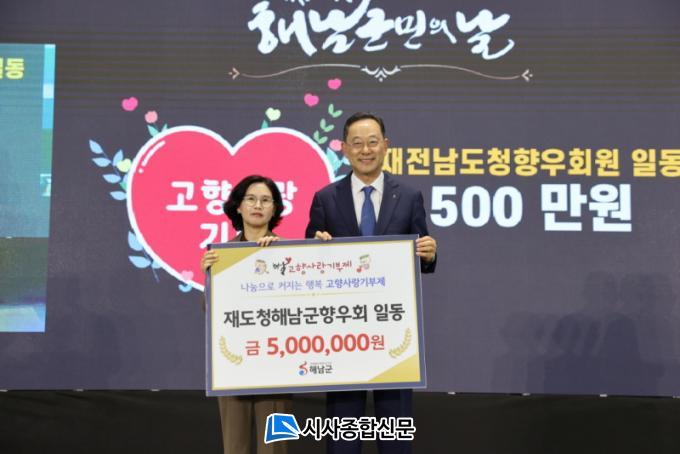 Àü¶ó³²µµÃ»¿¡¼ ±Ù¹«ÇÏ´Â ÇØ³² Ãâ½Å °øÁ÷ÀÚµé·Î ±¸¼ºµÈ ÀçÀü³²µµÃ»Çس²±º Çâ¿ìȸ¿¡¼µµ ÇØ³²±º °íÇâ»ç¶û±âºÎÁ¦ ÀÀ¿ø¿¡ ½Ê½ÃÀÏ¹Ý ¶æÀ» ¸ð¾Æ 500¸¸¿øÀ» ±âŹÇßÀ¸¸ç, ÇØ³²±º Ãâ½ÅÀ¸·Î Æó±â¹° ó¸® ¹× ÀÚ¿ø Àç»ý¾÷ü¸¦ ¿î¿µÇÏ´Â Á¦ÁÖûÁ¤·ÎÁö½º(ÁÖ) ÀÓ¿¬½Ä ´ëÇ¥´Â °íÇâ¿¡ ´ëÇÑ °¨»çÀÇ ¸¶À½À» ´ã¾Æ 200¸¸¿øÀ» ±âŹÇß´Ù.
