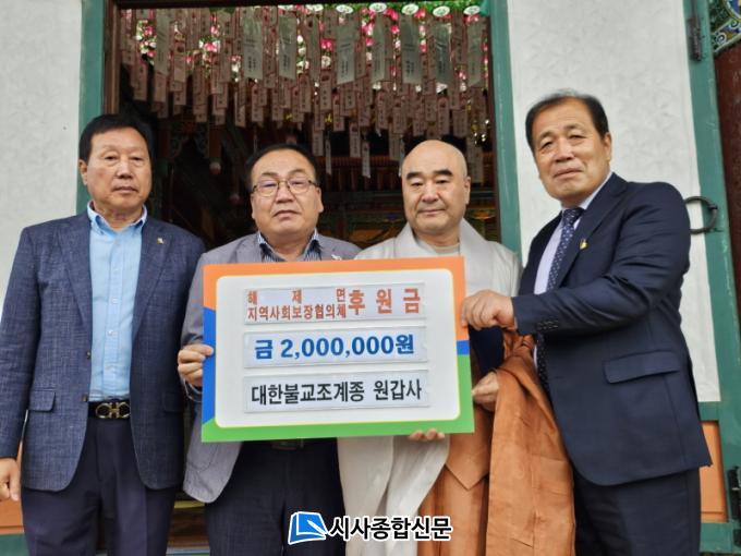 [½Ã»çÁ¾ÇսŹ® = ¿À½ÂÅà ±âÀÚ] ¹«¾È±º ÇØÁ¦¸é¿¡ ¼ÒÀçÇÑ ¿ø°©»ç(ÁÖÁö ¹ý»ê ½º´Ô)´Â ºÎó´Ô¿À½Å³¯À» ¸Â¾Æ Áö³ 5ÀÏ ÇØÁ¦¸é Áö¿ª»çȸº¸ÀåÇùÀÇü(°øµ¿À§¿øÀå ¹Ú¼º¼, ±è´ë¿µ)¿¡ ÈÄ¿ø±Ý 200¸¸ ¿øÀ» ±âŹÇÏ¸ç µû¶æÇÑ ³ª´®À» ½ÇõÇß´Ù.