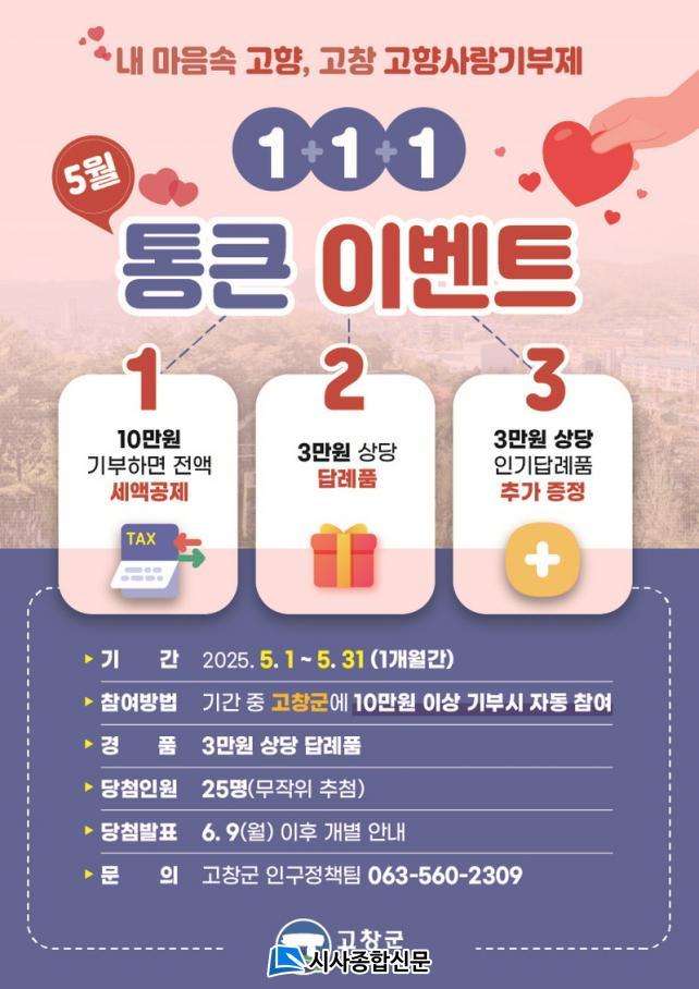 °íⱺ °ü°èÀÚ´Â ¡°5¿ù °¡Á¤ÀÇ ´ÞÀ» ¸Â¾Æ °íÇâÀ» »ç¶ûÇÏ´Â ¸¶À½À» ÀüÇÏ´Â ±âºÎÀڵ鿡°Ô °¨»çÀÇ ¸¶À½À» Ưº°ÇÑ ÇýÅÃÀ¸·Î º¸´äÇϰíÀÚ À̹ø À̺¥Æ®¸¦ ¸¶·ÃÇß´Ù¡±¶ó¸ç, ¡°À̹ø ¡®1+1+1 ÅëÅ« À̺¥Æ®¡¯¸¦ ÅëÇØ ´õ ¸¹Àº ºÐµéÀÌ °íÇâ»ç¶û±âºÎÁ¦¿¡ µ¿ÂüÇϰí, °íâÀÇ ¸Å·ÂÀ» ´À²¸º¸½Ã±æ ¹Ù¶õ´Ù¡±¶ó°í ÀüÇß´Ù.