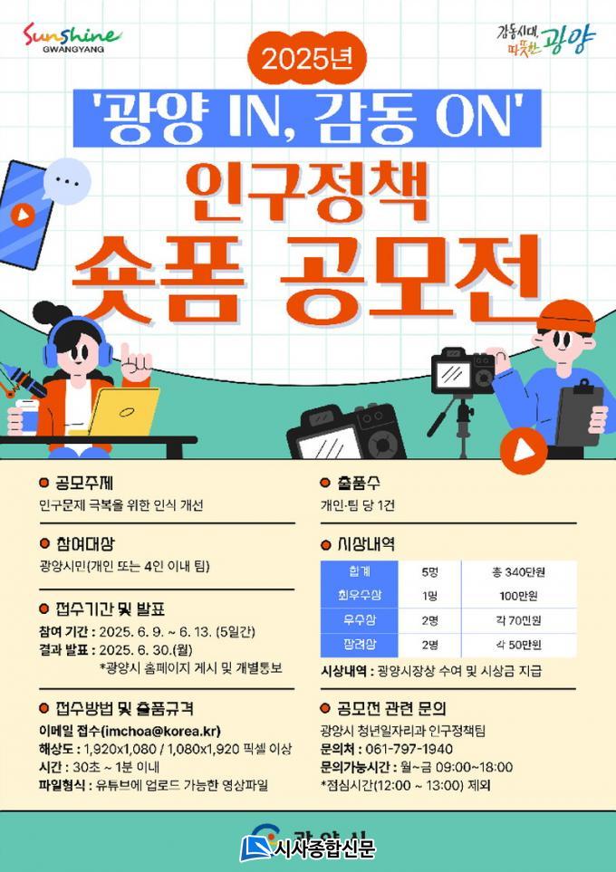 °ø¸ðÀü°ú °ü·ÃÇÑ ÀÚ¼¼ÇÑ »çÇ×Àº ±¤¾ç½Ã ȨÆäÀÌÁö °í½Ã¡¤°ø°í¶õ¿¡¼ È®ÀÎÇϰųª, ±¤¾ç½Ãû û³âÀÏÀÚ¸®°ú Àα¸Á¤Ã¥ÆÀ(¢Ï061-797-1940)À¸·Î ¹®ÀÇÇÏ¸é µÈ´Ù.