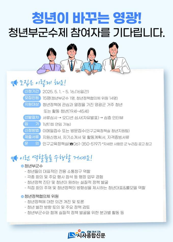 ¸ðÁý ºÐ¾ß´Â ¡ãû³â ºÎ±º¼ö 1¸í ¡ãû³âÁ¤Ã¥À§¿ø 14¸íÀ¸·Î, ¸¸ 19¼¼ºÎÅÍ 45¼¼ ÀÌÇÏÀÇ ¿µ±¤±º °ÅÁÖÀÚ ¶Ç´Â °ü³»¿¡¼ Ȱµ¿ ÁßÀΠû³âÀÌ¸é ´©±¸³ª Áö¿øÇÒ ¼ö ÀÖ´Ù. ¸ðÁý ¸¶°¨Àº ¿À´Â 5¿ù 16ÀϱîÁö´Ù.