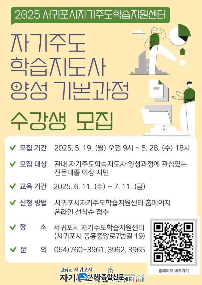 ¸ðÁý ´ë»óÀº µµ³» ÀÚ±âÁÖµµÇнÀ¿¡ °ü½É ÀÖ´Â Àü¹®´ëÁ¹ ÀÌ»óÀÇ ½Ã¹Î(20¸í)À̸ç, ¸ðÁý ±â°£Àº 5¿ù 19ÀϺÎÅÍ 5¿ù 28ÀϱîÁö ¼±ÍÆ÷½Ã ÀÚ±âÁÖµµÇнÀÁö¿ø¼¾ÅÍ È¨ÆäÀÌÁö(https://edu.seogwipo.go.kr/self/index.htm)¸¦ ÅëÇØ ¼±Âø¼ø Á¢¼ö·Î ÁøÇàµÈ´Ù.