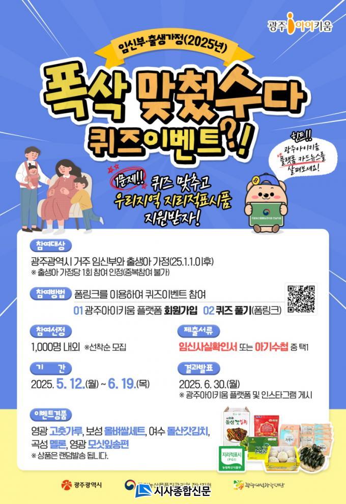 Áö¿ø ´ë»óÀº ÀÓ»êºÎ ¶Ç´Â 2025³â 1¿ù 1ÀÏ ÀÌÈÄ Ãâ»êÇÑ °¡Á¤À̸ç, ¡®±¤ÁÖ¾ÆÀÌŰ¿ò(www.±¤ÁÖ¾ÆÀÌŰ¿ò.kr)¡¯ Ç÷§ÆûÀ» ÅëÇØ °£´ÜÇÑ ÄûÁ Ç®°í ÀÓ½ÅÈ®Àμ, ¾Æ±â¼öø µî Áõºù¼·ù¸¦ Á¦ÃâÇÏ¸é µÈ´Ù. ¼±Âø¼ø 1000°¡±¸¸¦ ´ë»óÀ¸·Î Çϸç, Àü³²Áö¿ª Áö¸®ÀûÇ¥½Ã ³ó»ê¹° 5Á¾ ¼¼Æ®(2¸¸¿ø »ó´ç)¸¦ ¹«»ó Á¦°øÇÑ´Ù.