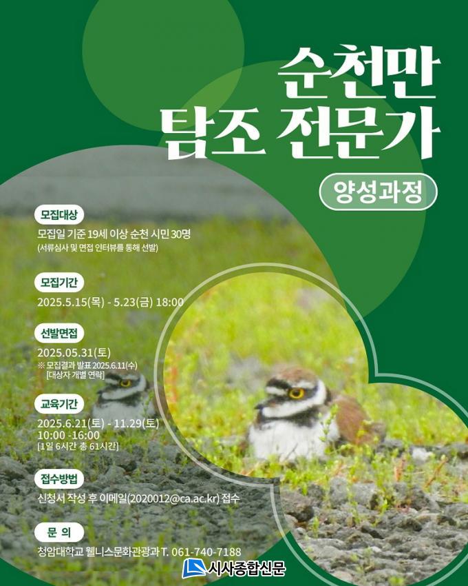 À̹ø ±³À°Àº À¯³×½ºÄÚ ¼¼°èÀÚ¿¬À¯»ê ¼øÃµ¸¸ÀÇ »ýŰ¡Ä¡¸¦ ³Î¸® ¾Ë¸®°í, ¶÷»ç¸£ ½ÀÁöµµ½Ã·Î ÁöÁ¤µÈ ¼øÃµÀÇ Å½Á¶°ü±¤ Ȱ¼ºÈ¸¦ À§ÇØ À۳⿡ ÀÌ¾î µÎ ¹øÂ°·Î ¿î¿µµÇ¸ç û¾Ï´ëÇб³°¡ ÁÖ°üÇÑ´Ù. ¸ðÁý ´ë»óÀº ¼øÃµ½Ã¿¡ °ÅÁÖÇÏ´Â 19¼¼ ÀÌ»ó ¼ºÀÎ 30¸íÀ̸ç, ¼·ù½É»ç¿Í ¸éÁ¢À» °ÅÃÄ ÃÖÁ¾ ¼±¹ßÇϰí, °á°ú´Â 6¿ù 11ÀÏ¿¡ °³º° ÅëÁöµÈ´Ù.