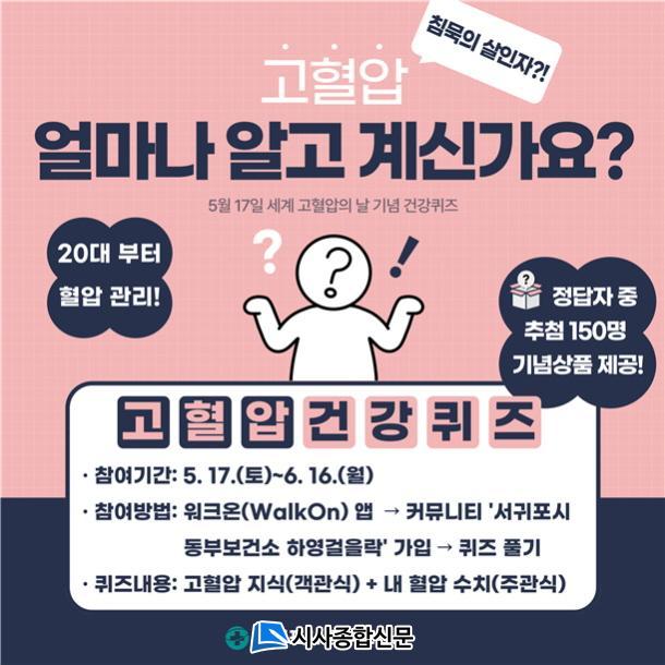 ¼±ÍÆ÷½Ã µ¿ºÎº¸°Ç¼Ò °ü°èÀÚ´Â ¡°À̹ø °Ç° ÄûÁî À̺¥Æ®´Â ´Ü¼øÇÑ Á¤º¸ Àü´ÞÀ» ³Ñ¾î, ÁֹεéÀÌ ÀÚ½ÅÀÇ Ç÷¾Ð ¼öÄ¡¸¦ ¾Ë°í, ½º½º·Î °Ç°À» °ü¸®ÇÏ´Â °è±â¸¦ ¸¶·ÃÇϰíÀÚ ±âȹµÆ´Ù¡±¶ó¸ç ¡°¾ÛÀ» ÅëÇÑ °È±â¿Í ÇÔ²² °Ç° ÄûÁî Âü¿©·Î °íÇ÷¾Ð ¿¹¹æ ½ÇõÀ» »ýȰÈÇØ º¸½Ã±æ ¹Ù¶õ´Ù¡±¶ó°í ÀüÇß´Ù.