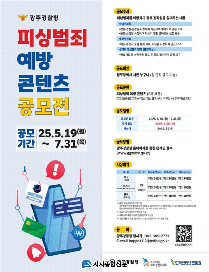 °ø¸ðÀüÀº ¡¯25. 5. 19. ~ 7. 31.(74ÀÏ) ±â°£¿¡ °ÉÃÄ ¿µ»ó(¼ôÆû), Æ÷½ºÅÍ(¼Õ±×¸²¡¤À¥Æ÷½ºÅÍ¡¤Ä«µå´º½º), Ç¥¾î(½½·Î°Ç) 3°³ ºÎ¹®À¸·Î ÁøÇàµÇ¸ç, ±¤ÁֽùÎÀÌ¸é ´©±¸³ª Âü¿©ÇÒ ¼ö ÀÖ°í, °³ÀÎ ¶Ç´Â ÆÀ ´ÜÀ§·Îµµ ÀÀ¸ð ÇÒ ¼ö ÀÖ´Ù. °ø¸ðÀüÀº ±¤ÁÖ°æÂûû ȨÆäÀÌÁö(www.gjpolice.go.kr)¸¦ ÅëÇØ Á¢¼ö°¡ °¡´ÉÇÏ´Ù.