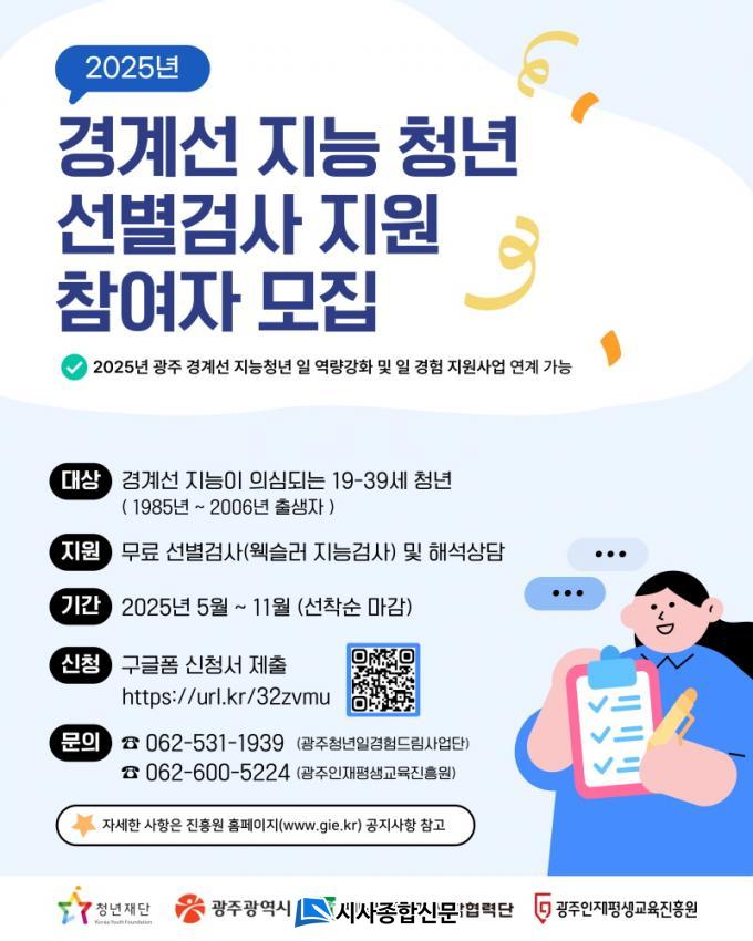 ½Åû¼ Á¢¼ö ÈÄ ¾È³»¿¡ µû¶ó ¸ÕÀú ¿Â¶óÀÎ °£ÀÌ Ã¼Å©¸®½ºÆ®(¼ºÀÎ °æ°è¼± ÁöÀû±â´É ¼±º° üũ¸®½ºÆ®)¸¦ ½Ç½ÃÇÏ°Ô µÈ´Ù. ½Ç½Ã °á°ú¿¡ µû¶ó ÃÖÁ¾ ¼±º°°Ë»çÀÎ À¡½½·¯ Áö´É°Ë»ç Âü¿©ÀÚ°¡ °áÁ¤µÈ´Ù. ÁøÈï¿øÀº ±¤ÁÖû³âÀÏÀÚ¸®½ºÅ×ÀÌ¼Ç µ¿¸í ³» °ø°£À» Ȱ¿ëÇØ Àü¹® ÀÓ»ó½É¸®»ç¸¦ ÆÄ°ß, Áö¿ª û³âµé¿¡°Ô ã¾Æ°¡´Â Áö´É°Ë»ç¿Í ÇØ¼®»ó´ãÀ» ¹«·á·Î Áö¿øÇÒ ¹æÄ§ÀÌ´Ù.