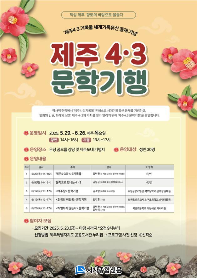 ¡â1Â÷½Ã ¡®Á¦ÁÖ 4¡¤3°ú ±â·Ï¹°¡¯(°»ç: °´öȯ Àü Á¦ÁÖµµÀÇȸ Á¤Ã¥¿¬±¸À§¿ø)¡¯ , ¡â2Â÷½Ã ¡®¹®ÇÐÀ¸·Î ¸¸³ª´Â 4¡¤3¡¯(±èµ¿À± Á¦ÁÖ´ëÇб³ ±¹¾î±¹¹®Çаú ±³¼ö)¡¯, ¡â3Â÷½Ã ¡®<Á¦ÁÖÇ×> ¹®ÇбâÇ࡯(±è¼Ò¿µ Á¦ÁÖ´ë ¹Ú»ç°úÁ¤)¡¯, ¡â4Â÷½Ã ¡®<ħ¹¬ÀÇ ºñ¸Á·Ï> ¹®ÇбâÇà(±è°æÈÆ ½ÃÀÎ)¡¯, ¡â5Â÷½Ã ¡®<ÀÛº°ÇÏÁö ¾Ê´Â´Ù> ¹®ÇбâÇà(°´öȯ Àü Á¦ÁÖµµÀÇȸ Á¤Ã¥¿¬±¸¿ø, ±è¿¬¹Ì ½ÃÀÎ)À¸·Î ÁøÇàµÈ´Ù.