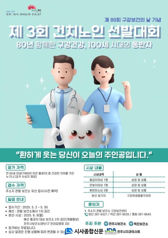 °ÇÄ¡³ëÀÎ ¼±¹ß´ëȸ´Â ±¸°°Ç° °ü¸®¸¦ ÀßÇØ °Ç°ÇÑ Ä¡¾Æ¸¦ º¸À¯ÇÏ°í °Ç°ÇÑ ÀÕ¸ö »óŸ¦ °¡Áø 65¼¼ ÀÌ»ó Áö¿ª ³ëÀÎÀ» °Ý·ÁÇϰí, ±¸°°Ç°ÀÇ Á߿伺À» È«º¸Çϱâ À§ÇØ ÃßÁøµÈ´Ù. ´ëȸ¿¡ Âü¿©¸¦ ¿øÇÏ´Â ³ëÀÎÀº ¿À´Â 30ÀϱîÁö ÀüÁֽú¸°Ç¼Ò ±¸°º¸°Ç¼¾ÅÍ(063-281-6321) ¶Ç´Â ´öÁøº¸°Ç¼Ò ±¸°º¸°Ç¼¾ÅÍ(063-281-8535)·Î ÀüÈ ½ÅûÇÏ¸é µÈ´Ù.
