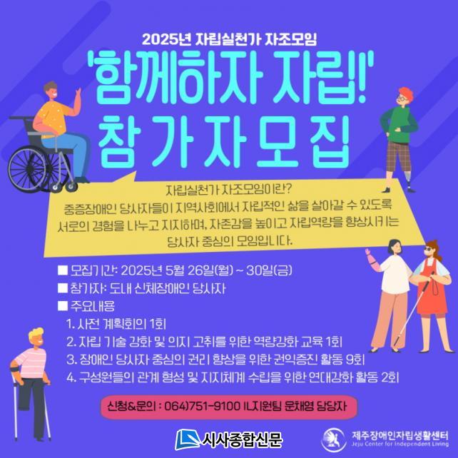 [½Ã»çÁ¾ÇսŹ® = °í¼º¹Î ±âÀÚ] Á¦ÁÖÀå¾ÖÀÎÀÚ¸³»ýȰ¼¾ÅÍ(¼¾ÅÍÀå ¼ÛâÇå)´Â 5¿ù 26ÀϺÎÅÍ 30ÀϱîÁö 2025³â ÀÚ¸³½Çõ°¡ ÀÚÁ¶¸ðÀÓ ¡®ÇÔ²²ÇÏÀÚ ÀÚ¸³!¡¯¿¡ Âü°¡ÇÒ µµ³» ½ÅüÀå¾ÖÀÎ ´ç»çÀÚ¸¦ ¸ðÁýÇÑ´Ù.