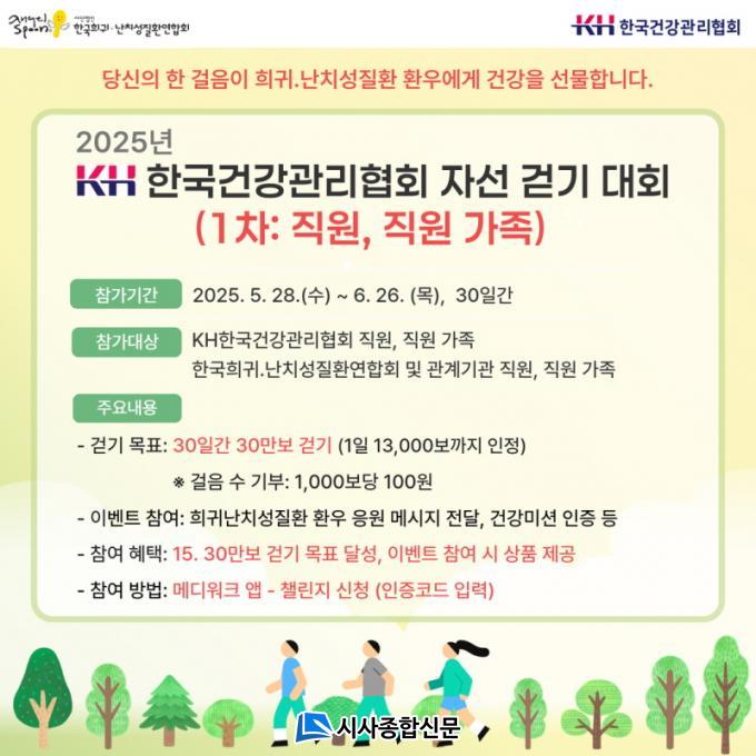 Âü°¡ÀÚ´Â ÇÏ·ç 1¸¸ º¸¾¿ 30Àϰ£ ÃÑ 30¸¸ º¸ °È±â¸¦ ¸ñÇ¥·Î Çϸç, ±â·ÏµÈ °ÉÀ½ ¼ö´Â 1,000º¸´ç 100¿øÀ¸·Î ȯ»êµÇ¾î Çѱ¹Èñ±Í³Ä¡¼ºÁúȯ¿¬ÇÕȸ¿¡ Ä¡·áºñ·Î ±âºÎµÉ ¿¹Á¤ÀÌ´Ù.