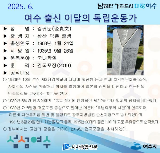 ÇÑÆí, ¿©¼ö½Ã´Â Áö¿ª Ãâ½Å µ¶¸³¿îµ¿°¡ÀÇ ¿ª»çÀû °¡Ä¡ ÀçÁ¶¸í°ú µ¶¸³ Á¤½Å È®»êÀ» À§ÇØ Áö³ 2022³â 8¿ùºÎÅÍ µ¶¸³¿îµ¿°¡À¯Á·È¸¿Í °øµ¿À¸·Î ¿©¼ö Ãâ½Å µ¶¸³¿îµ¿°¡¸¦ ¹ß±¼¡¤¼±Á¤ÇØ È«º¸Çϰí ÀÖÀ¸¸ç ÇöÀç±îÁö 83¸íÀ» Ãß¼Çß´Ù.