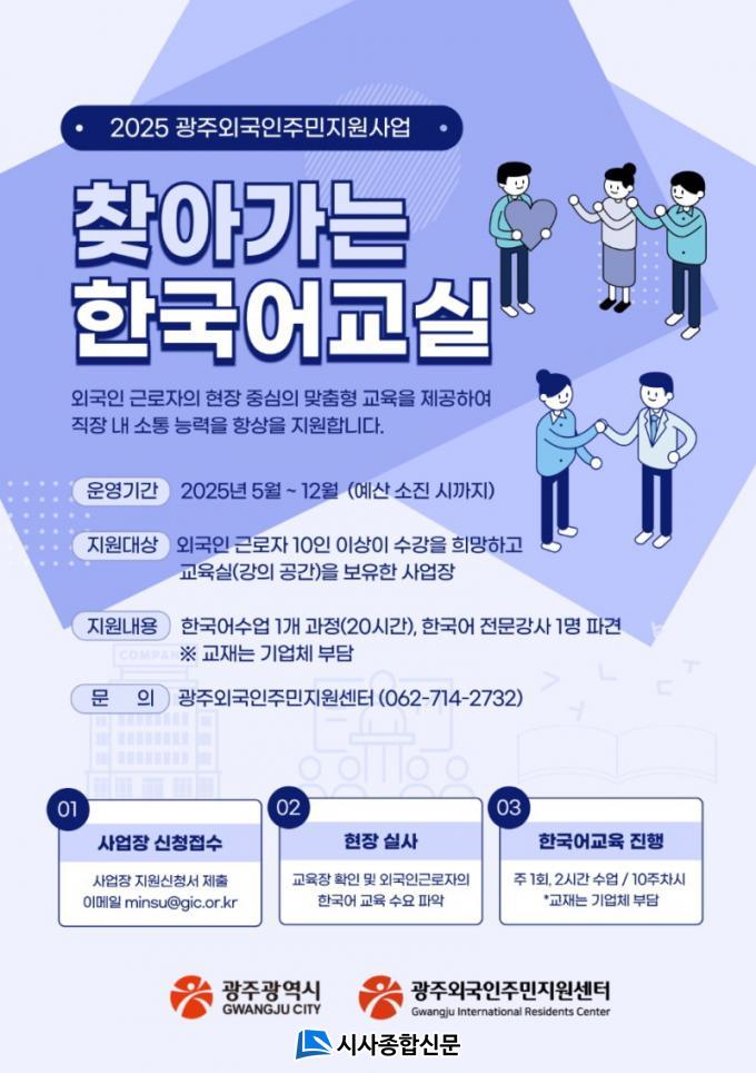 ±¤Áֽô ±³À° ¼ö°À» Èñ¸ÁÇÏ´Â Æòµ¿»ê´Ü ³» »ç¾÷Àå¿¡ ´ëÇÑ Ãß°¡ ¸ðÁýµµ ÁøÇàÇÑ´Ù. ¿Ü±¹ÀαٷÎÀÚ 10ÀÎ ÀÌ»óÀÌ ¼ö°À» Èñ¸ÁÇÏ°í ±³À°½ÇÀ» º¸À¯ÇÑ »ç¾÷ÀåÀÌ¸é °¡´ÉÇÏ´Ù. ±¤Áֿܱ¹ÀÎÁÖ¹ÎÁö¿ø¼¾ÅÍ(062-714-2732)¸¦ ÅëÇØ ¹®ÀÇ ¹× ½ÅûÇÏ¸é µÈ´Ù.