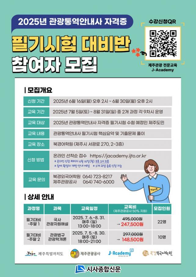 Á¦ÁÖµµ¿Í °ø»ç´Â ÃÑ ¼ö°·áÀÇ 50%¸¦ Áö¿øÇϸç, Çʱ⠴ëºñ ÁÖ¸» 1¹ÝÀº 22¸í, Çʱ⠴ëºñ ÁÖ¸» 2¹ÝÀº 10¸íÀ» ¼±Âø¼øÀ¸·Î ¸ðÁýÇÒ °èȹÀÌ´Ù. ¿ÃÇØ °ü±¤Å뿪¾È³»»ç 1, 2Â÷ ½ÃÇèÀÇ Á¤±â Á¢¼ö´Â ¿À´Â 7¿ù 7ÀϺÎÅÍ 11ÀϱîÁö¸ç, 1Â÷ ½ÃÇè Çʱâ´Â 9¿ù 6ÀÏ, 2Â÷ ½ÃÇè ¸éÁ¢Àº 11¿ù 15ÀϺÎÅÍ 16ÀϱîÁö ÁøÇàµÈ´Ù. ½ÃÇè¿¡ ´ëÇÑ ÀÚ¼¼ÇÑ Á¤º¸´Â Çѱ¹»ê¾÷Àη°ø´Ü Å¥³Ý(Q-Net, https://www.q-net.or.kr) ȨÆäÀÌÁö¿¡¼ È®ÀÎÀÌ °¡´ÉÇÏ´Ù.