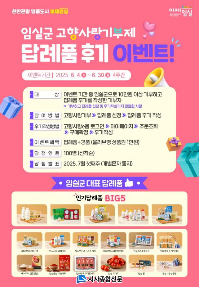 ÀӽDZº¿¡ µû¸£¸é 6¿ù 4ÀϺÎÅÍ 30ÀϱîÁö °íÇâ»ç¶ûeÀ½ »çÀÌÆ®¿¡¼ ÁøÇàµÇ´Â À̹ø À̺¥Æ®´Â ÀӽDZº¿¡ 10¸¸ ¿ø ÀÌ»ó ±âºÎÇϰí, ´ä·ÊǰÀ» ½ÅûÇÑ ÈÄ Èı⸦ ÀÛ¼ºÇÏ¸é º°µµ ½Åû ¾øÀÌ ÀÚµ¿À¸·Î ÀÀ¸ðµÈ´Ù.
