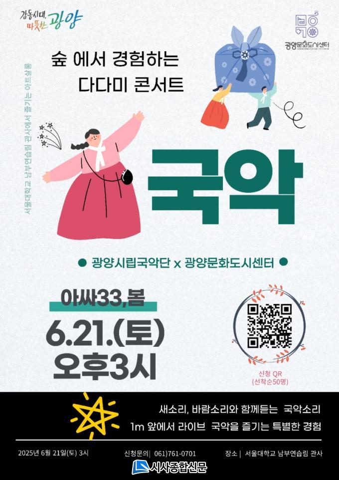 À̹ø ȸÂ÷´Â ±¤¾ç½Ã¸³±¹¾Ç´Ü ·ùÇü¼± ¿¹¼ú°¨µ¶ÀÇ ÇØ¼³°ú ÇÔ²² 7°³ Å׸¶·Î ±¸¼ºµÈ 60ºÐ ¶óÀÌºê °ø¿¬À¸·Î ²Ù¸çÁø´Ù. ±¹¾Ç´ÜÀº <±èÁׯķù °¡¾ß±Ý »êÁ¶>, <û¼ºÀÚÁøÇÑÀÙ>, <°¡¾ß±ÝÀÌ Àִ dz°æ>, <Ű Å« ³ª¹«½£>, <½ÅÄ赿·ù °Å¹®°í »êÁ¶>, <¹«¿µÅ¾>, <¹Ì·Î> µî ´Ù¾çÇÑ °îÀ» ÁغñÇßÀ¸¸ç, ¼¿ï´ë ³²ºÎ¿¬½À¸² °ü»çÀÇ °íÀ¯ÇÑ °ø°£°¨°ú ¾î¿ì·¯Áö´Â »ý»ýÇÑ ±¹¾ÇÀÇ ¿ï¸²ÀÌ °ü°´µé¿¡°Ô ±íÀº °¨µ¿À» ÀüÇÒ °ÍÀ¸·Î ±â´ëµÈ´Ù.