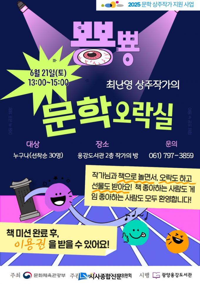 ±¤¾ç¿ë°µµ¼°üÀº ¹®ÇÐÀ» »õ·Î¿î ³îÀ̹®È·Î Á¤Âø½Ã۱â À§ÇØ 2025³â »óÁÖÀÛ°¡ÀÎ ÃÖ³¿µ ÀÛ°¡¿Í ÇÔ²² À̹ø ÇÁ·Î±×·¥À» ±âȹÇßÀ¸¸ç, ¹®ÇÐÀ» ³îÀÌ ¿ä¼Ò¿Í °áÇÕÇØ µ¶¼³ª µµ¼°ü¿¡ Àͼ÷ÇÏÁö ¾ÊÀº ½Ã¹Îµéµµ ÀÚ¿¬½º·´°Ô ¹®Çаú Ä£¼÷ÇØÁú ¼ö ÀÖµµ·Ï ³»¿ëÀ» ±¸¼ºÇß´Ù.