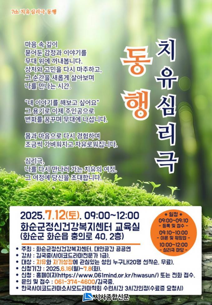 ÇÁ·Î±×·¥Àº 7¿ù 12ÀÏ Åä¿äÀÏ 9½ÃºÎÅÍ 12½Ã±îÁö ȼø±ºÁ¤½Å°Ç°º¹Áö¼¾ÅÍ ±³À°½Ç¿¡¼ ÀÌ·ç¾îÁø´Ù. ¡®Ä¡À¯¡¯¿Í ¡®Àڱ⠼ºÀ塯¿¡ °ü½É ÀÖ´Â Áö¿ª ÁÖ¹ÎÀÌ¸é ´©±¸³ª Âü°¡ÇÒ ¼ö ÀÖÀ¸¸ç, ¼±Âø¼ø 20¸íÀ» ¸ðÁýÇÑ´Ù. Âü°¡ ½ÅûÀº 7¿ù 8ÀÏ È¿äÀϱîÁö ȼø±ºÁ¤½Å°Ç°º¹Áö¼¾ÅÍ È¨ÆäÀÌÁö ¶Ç´Â ÀüÈ(¢Ï061-374-4600)·Î °¡´ÉÇÏ´Ù.