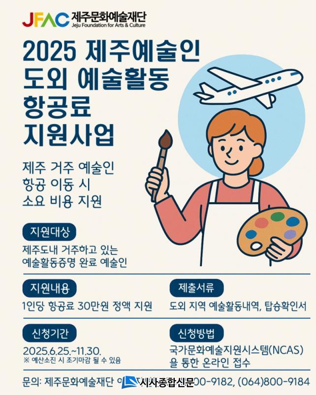 Áö¿ø ´ë»óÀº Á¦ÁÖÆ¯º°ÀÚÄ¡µµ¿¡ Áֹεî·ÏÀÌ µÇ¾î ÀÖ°í, ¿¹¼úȰµ¿Áõ¸íÀ» ¿Ï·áÇÑ ¿¹¼úÀÎÀÌ´Ù. 2025³â 1¿ù 1ÀÏ ÀÌÈÄ µµ¿Ü ¿¹¼úȰµ¿À» ¿Ï·áÇϰí ÁõºùÀÚ·á(µµ·Ï, ž½ÂÈ®Àμ µî)¸¦ Á¦ÃâÇϸé 1Àδç 30¸¸¿øÀÇ Ç×°ø·á¸¦ Á¤¾× Áö¿øÇÑ´Ù. ÃÑ 6õ¸¸ ¿øÀÇ ¿¹»êÀ¸·Î ¼±Âø¼ø 200¸íÀ» Áö¿øÇÒ ¿¹Á¤ÀÌ´Ù.