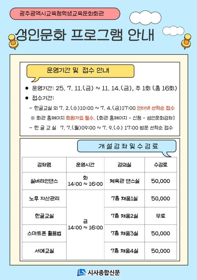 ÇÁ·Î±×·¥Àº ¡ã½Ç¹ö¶óÀÎ´í½º ¡ã³ëÈÄÀÚ»ê°ü¸® ¡ãÇѱ۱³½Ç ¡ã½º¸¶Æ®Æù Ȱ¿ë¹ý ¡ã¼¿¹±³½Ç µî 5°³ °Á·Π±¸¼ºµÆÀ¸¸ç, 7¿ù 11ÀÏ~11¿ù 14ÀÏ ÁÖ 1ȸ¾¿ ÃÑ 16ȸ ¿î¿µµÈ´Ù.