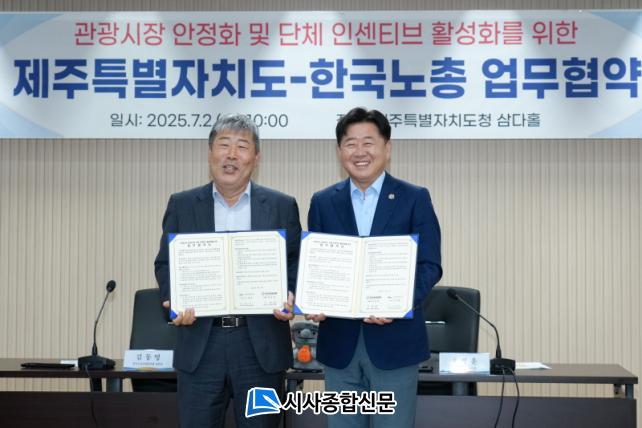 Á¦ÁÖµµ´Â 2ÀÏ µµÃ» »ï´ÙȦ¿¡¼ Çѱ¹³ëÃѰú ¡®°ü±¤½ÃÀå ¾ÈÁ¤È ¹× ´Üü Àμ¾Æ¼ºê Ȱ¼ºÈ¸¦ À§ÇÑ ¾÷¹«Çù¾à'À» ü°áÇϰí Á¦ÁÖ °ü±¤ Ȱ¼ºÈ¿Í ³ëµ¿Á¸Áß »çȸ ±¸Çö¿¡ ÇÔ²² ³ë·ÂÇÒ °ÍÀ» ¼±¾ðÇß´Ù.