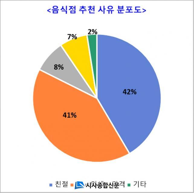 ÇÑÆí, À̺¥Æ®¿¡ Á¢¼öµÈ Ãßõ »çÀ¯¸¦ ºÐ¼®ÇÑ °á°ú ¡ã¡®Ä£Àý¡¯ÀÌ 42%·Î °¡Àå ³ôÀº ºñÁßÀ» Â÷ÁöÇßÀ¸¸ç, ÀÌ¾î¼ ¡ã¡®¸À¡¯ 41%, ¡ã¡®À§»ý¡¯ 8%, ¡ã¡®°¡°Ý¡¯ 7%, ¡ã¡®±âŸ¡¯ 2% ¼øÀ¸·Î ³ªÅ¸³µ´Ù. ÀÌ´Â ½Ã¹ÎµéÀÌ ´Ü¼øÈ÷ À½½ÄÀÇ ¸ÀÀ» ³Ñ¾î Á¤¼º°ú ¹è·Á°¡ ´ã±ä Ä£ÀýÇÑ ¼ºñ½º¿¡ °¨µ¿À» ¹Þ°í ÀÖÀ½À» º¸¿©ÁÖ´Â °á°ú·Î Ç®À̵ȴÙ.