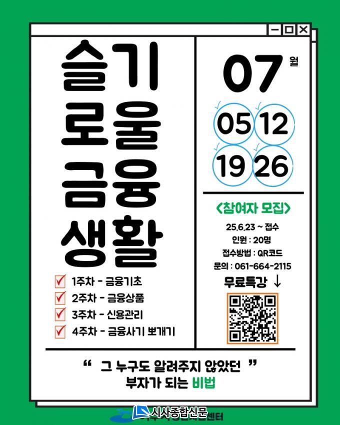 ù ¹øÂ° °Á´ ½Ç»ýȰ°ú ¹ÐÁ¢ÇÑ ±ÝÀ¶ ±³À° ¡®½½±â·Î¿ï ±ÝÀ¶»ýȰ¡¯·Î 7¿ù 5ÀϺÎÅÍ 26ÀϱîÁö 4ÁÖ°£ ¸ÅÁÖ Åä¿äÀÏ ¿ÀÀü 10½Ã 30ºÐºÎÅÍ 12½Ã±îÁö ¿©¼ö½Ãû³âÁö¿ø¼¾ÅÍ È¸Àǽǿ¡¼ ¿î¿µµÈ´Ù.