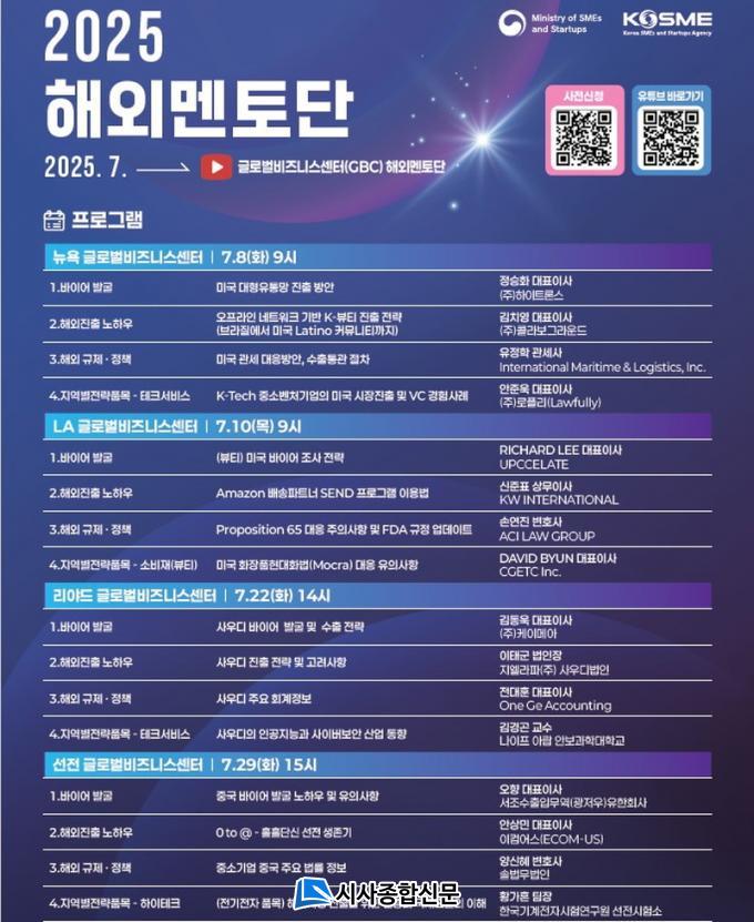 ¡®ÇؿܸàÅä´Ü ÇÁ·Î±×·¥¡¯Àº ¿ÃÇØ ÃÑ 21ȸ ¿î¿µÇÒ °èȹÀ¸·Î 7¿ù¿¡´Â ´º¿å GBC(7.8), LA GBC(7.10), ¸®¾ßµå GBC(7.22), ¼±Àü GBC(7.29)¿¡¼ ÁøÇàÇϸç, ÃßÈÄ ÀÏÁ¤°ú »ó¼¼ ÄÜÅÙÃ÷´Â À¯Æ©ºê ä³Î ¡®±Û·Î¹úºñÁî´Ï½º¼¾ÅÍ(GBC) ÇØ¿Ü¸àÅä´Ü(youtube.com/@2025mentor)¡¯¿¡¼ ¼øÂ÷ÀûÀ¸·Î °ø°³ÇÑ´Ù.