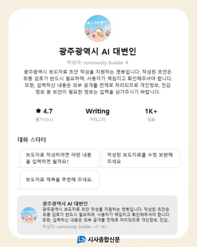 ÀÌ ¼ºñ½º´Â º¸µµÀÚ·á ¹× Á¤Ã¥ ¼³¸í¹® ÃÊ¾È ÀÛ¼º, ¹®¼ ¿ä¾à µî ½Ç¹« Àü¹Ý¿¡ Ȱ¿ë, °ø°øÈ«º¸ ǰÁú Çâ»ó¿¡µµ Å©°Ô ±â¿©Çϰí ÀÖ´Ù´Â Æò°¡¸¦ ¹Þ°í ÀÖ´Ù.´Ù. ÇöÀç(7¿ù1ÀÏ ±âÁØ) AI ´ëº¯ÀÎÀº 1000¸í ÀÌ»óÀÌ »ç¿ëÇϰí ÀÖÀ¸¸ç, »ç¿ëÀÚ ÆòÁ¡Àº 5Á¡ ¸¸Á¡¿¡ 4.7Á¡À» ±â·ÏÇÏ¸ç ³ôÀº ¸¸Á·µµ¸¦ º¸À̰í ÀÖ´Ù.