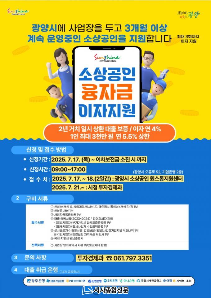 ½ÅûÀ» ¿øÇÏ´Â ¼Ò»ó°øÀÎÀº ±¤¾ç½Ã¼Ò»ó°øÀοø½ºÅéÁö¿ø¼¾ÅÍ(±¤¾ç½Ã ¿À·ù·Î 52, 2Ãþ)¿¡ ½Åû¼ ¹× ±¸ºñ¼·ù¸¦ Á¦ÃâÇØ¾ß Çϸç, Àü³²½Å¿ëº¸ÁõÀç´Ü¿¡¼ º¸Áõ¼¸¦ ¹ß±Þ¹Þ¾Æ Çù¾à ±ÝÀ¶±â°üÀ» ÅëÇØ ´ëÃâÀ» ½ÇÇàÇÏ¸é µÈ´Ù.