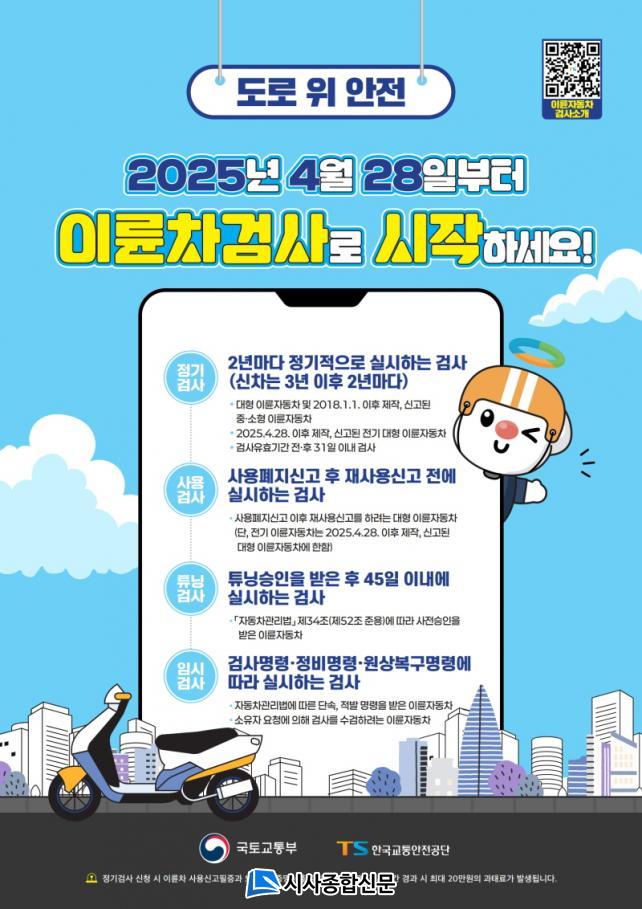 Á¤±â°Ë»ç ´ë»óÀº ¡â¹è±â·® 260cc Ãʰú ¶Ç´Â Á¤°ÝÃâ·Â 15kw ÃʰúÀÇ ´ëÇü ÀÌ·ûÀÚµ¿Â÷ ¡â2018³â 1¿ù 1ÀÏ ÀÌÈÄ Á¦ÀÛ ¹× ½Å°íµÈ Áß¡¤¼ÒÇü ÀÌ·ûÀÚµ¿Â÷ ¡â2025³â 4¿ù 28ÀÏ ÀÌÈÄ Á¦ÀÛ ¹× ½Å°íµÈ Àü±â ´ëÇü ÀÌ·ûÀÚµ¿Â÷ÀÌ´Ù. Á¤±â°Ë»ç´Â ÃÖÃÊ »ç¿ë½Å°íÀϷκÎÅÍ 3³â, ÀÌÈÄ¿¡´Â 2³â¸¶´Ù À¯È¿±â°£ ¸¸·áÀÏ ÀüˑÈÄ 31ÀÏ À̳»¿¡ ¹Þ¾Æ¾ß ÇÑ´Ù.
